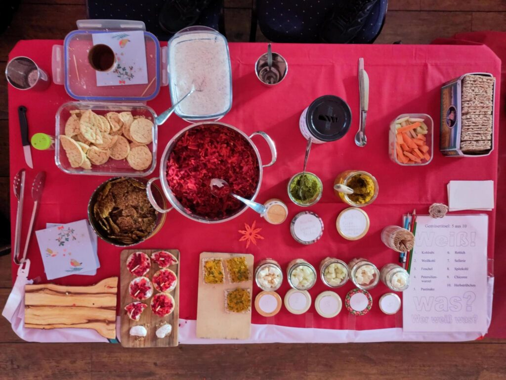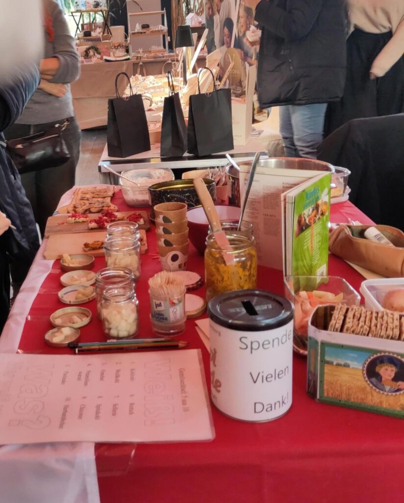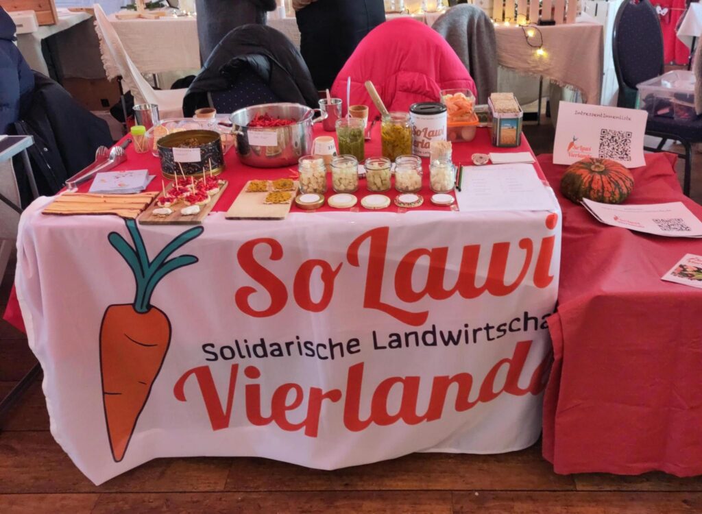 Der Infostand war liebevoll dekoriert – und vor allem prall gefüllt mit kleinen weihnachtlichen Kostproben aus unserem SoLawi Gemüse. Von aromatischem Gemüse-Aufstrich über winterliche Grünkohl Quiche bis hin zu frisch gebackenen Plätzchen: Wir wollten zeigen, wie vielfältig regionale Landwirtschaft schmecken kann.