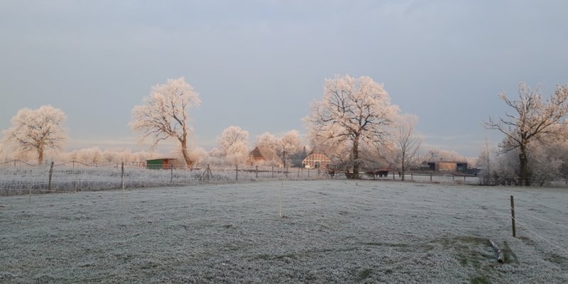 Der Frost hat uns schöne Eindrücke beschert. Und den Feldsalat gefrieren lassen, obwohl wir ihn unter ediner doppelten Vlies-Abdeckung hatten. Er war selbst am Nachmittag nicht aufgetaut, so mussten wir die Ernte auf den nächsten Tag verschieben.